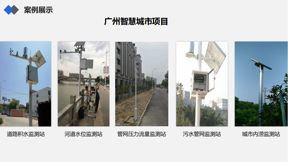 1.广州智慧城市项目:部署道路/城市内涝积水监测站、河道水位监测站、管网压力流量监测站,实现城市水务与内涝防治智能化监测;